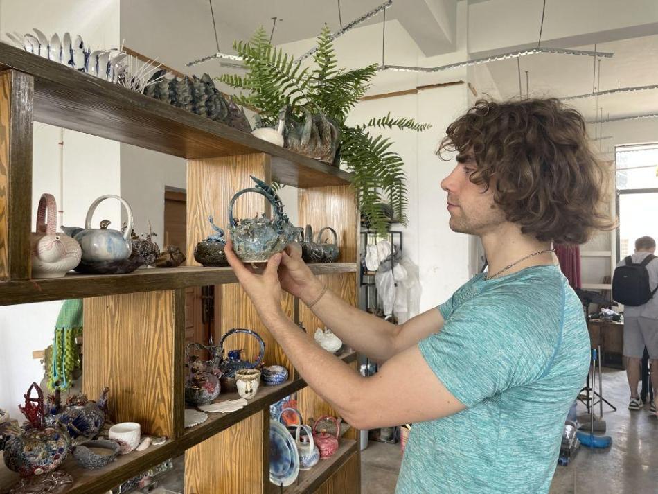 ↑在江西景德鎮(zhèn),美國青年丹尼斯在工作室內整理陶瓷作品(2023年5月30日攝)。