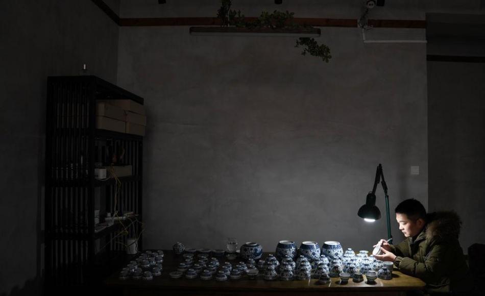 ↑ 2020年12月23日,手工陶瓷制作者在工作室檢測成品。