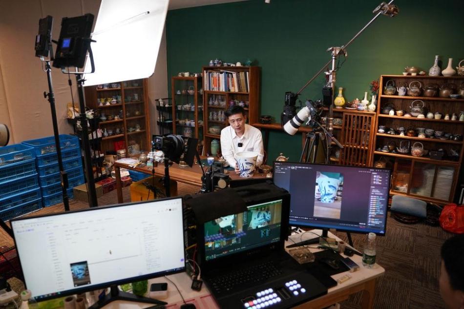 ↑在景德鎮(zhèn),工作人員通過網(wǎng)絡直播推介陶瓷產(chǎn)品(2023年2月22日攝)。