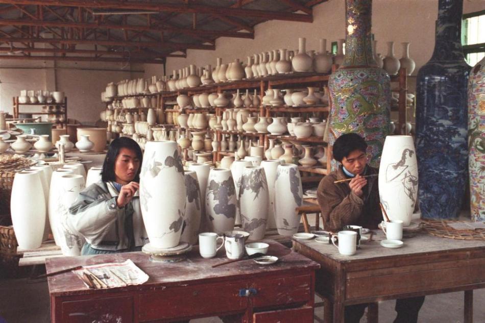 ↑ 1997年拍攝的景德鎮(zhèn)一瓷廠內的彩繪車間一角。