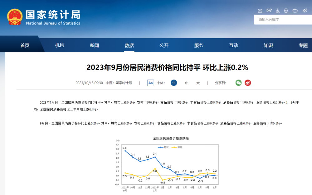 國家統(tǒng)計局:9月份居民消費價格同比持平 環(huán)比上漲0.2%
