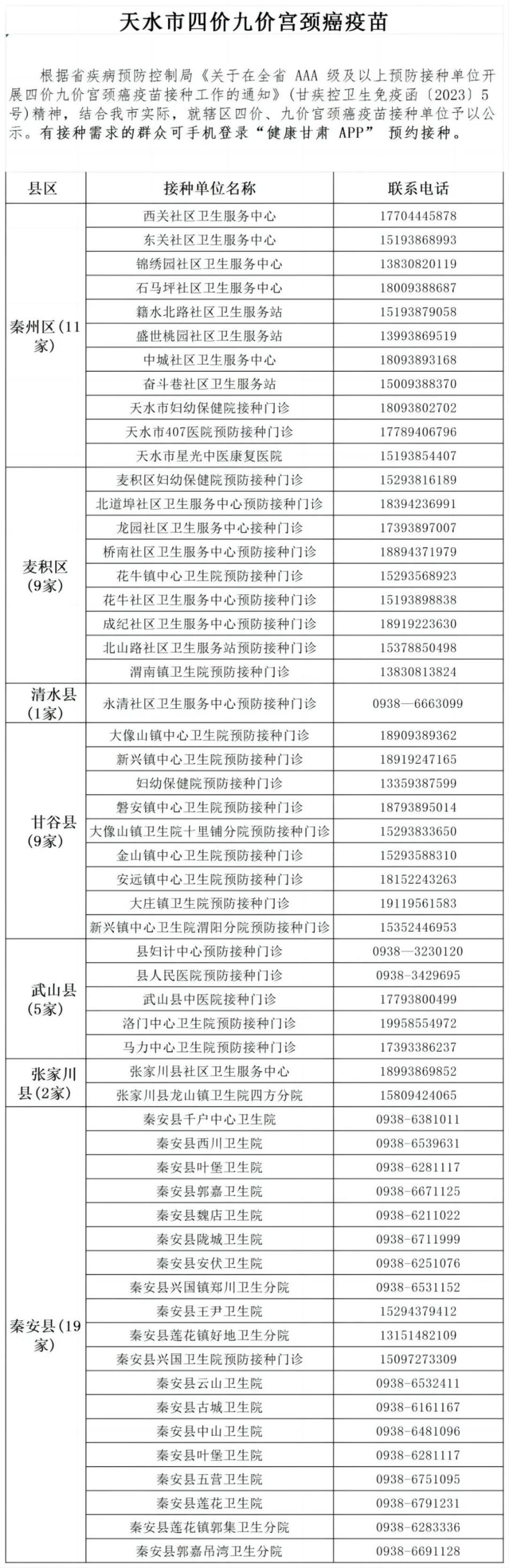 天水市四價(jià)九價(jià)宮頸癌疫苗接種單位公示