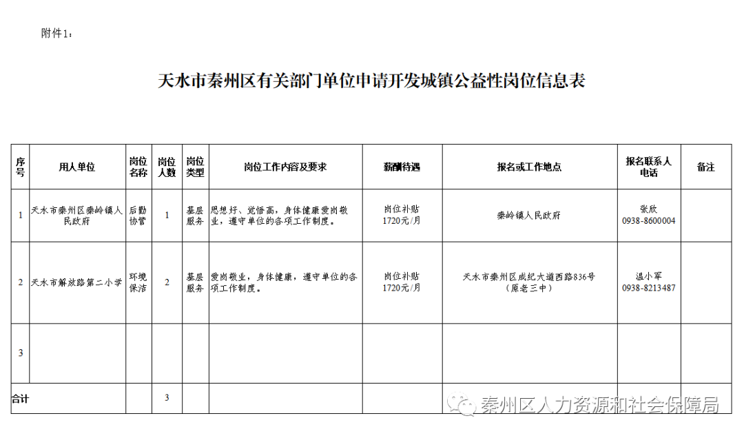 本次計(jì)劃公開招聘城鎮(zhèn)公益性崗位3名。詳見《天水市秦州區(qū)有關(guān)部門單位申請(qǐng)開發(fā)城鎮(zhèn)公益性崗位信息表》(附件1)。
