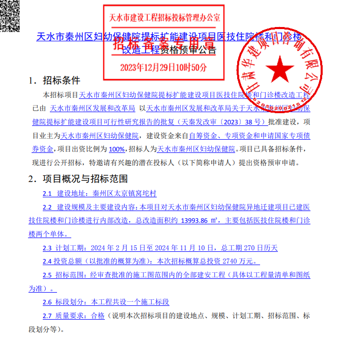 12月29日,天水市公共資源交易中心發(fā)布“天水市秦州區(qū)婦幼保健院提標擴能建設項目醫(yī)技住院樓和門診樓改造工程資格預審公告”,具體內(nèi)容如下: