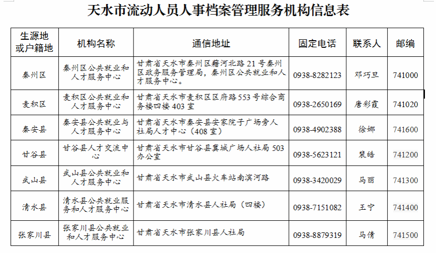 附表:《天水市流動人員人事檔案管理服務機構信息表》