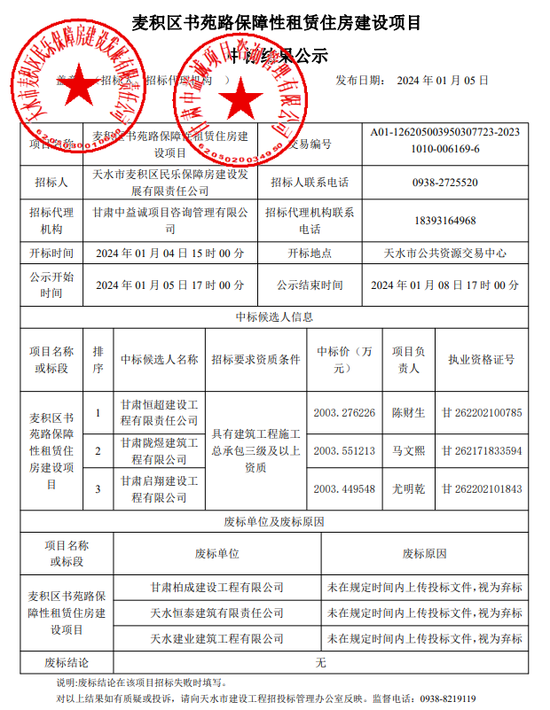 1月5日,天水市公共資源交易中心發(fā)布“麥積區(qū)書苑路保障性租賃住房建設項目中標結果公示”,根據(jù)公示內(nèi)容顯示,本次中標候選人為:甘肅恒超建設工程有限責任公司、甘肅隴煜建筑工程有限公司、甘肅啟翔建設工程有限公司,具體內(nèi)容如下: