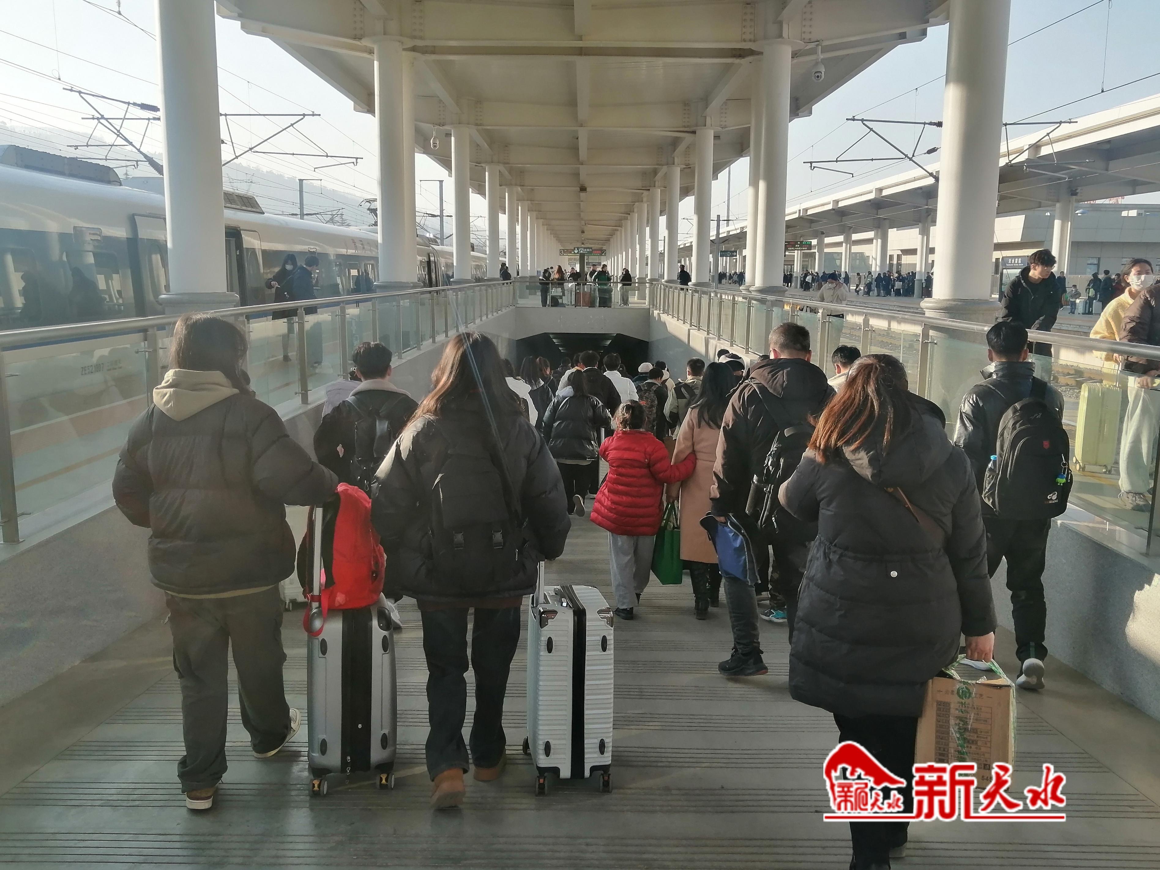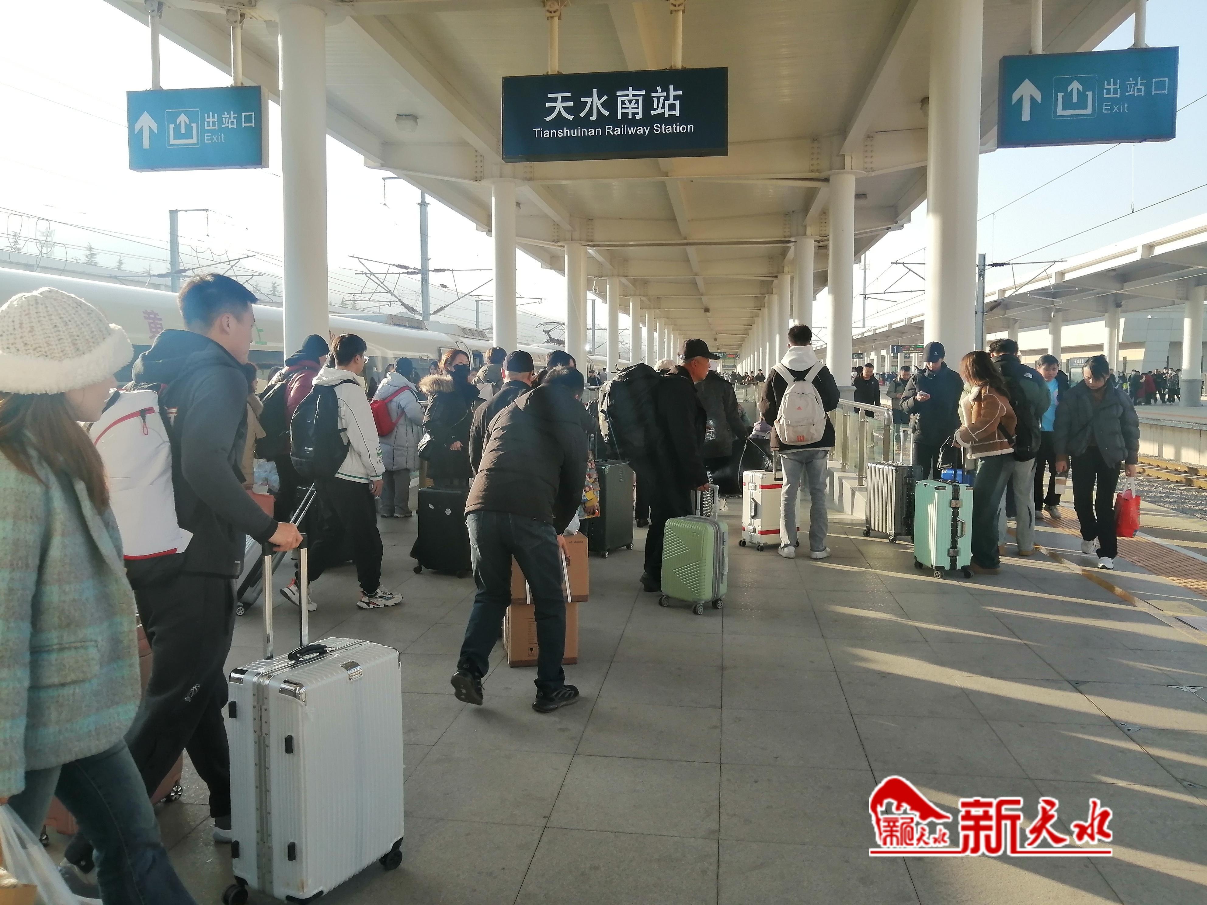 1月11日下午,記者在天水南站采訪時看到,北側站臺上有許多旅客正在排隊等待列車進站。在對面站臺,一趟從蘭州方向駛來的列車,下車的旅客人數(shù)明顯增多,旅客們提著大小行李箱通過地道來到出站口,然后有序排隊通過閘機出站。
