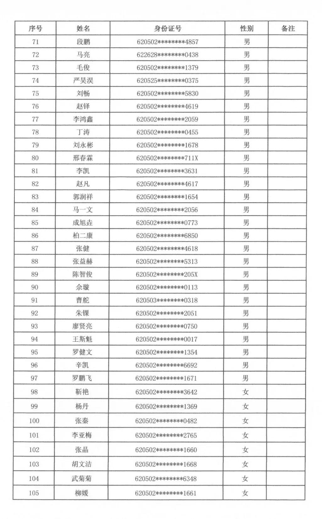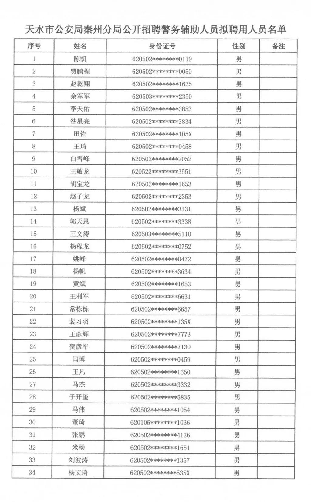根據(jù)天水市秦州區(qū)人力資源和社會(huì)保障局、天水市公安局秦州分局關(guān)于2023年公開(kāi)招聘警務(wù)輔助人員工作安排,通過(guò)筆試、面試、體檢、政審,擬聘用警務(wù)輔助人員男性97名、女性72名,現(xiàn)將擬聘用人員名單公示如下,廣泛接受社會(huì)各界的監(jiān)督。公示期滿后,將按程序辦理聘用派遣手續(xù)。