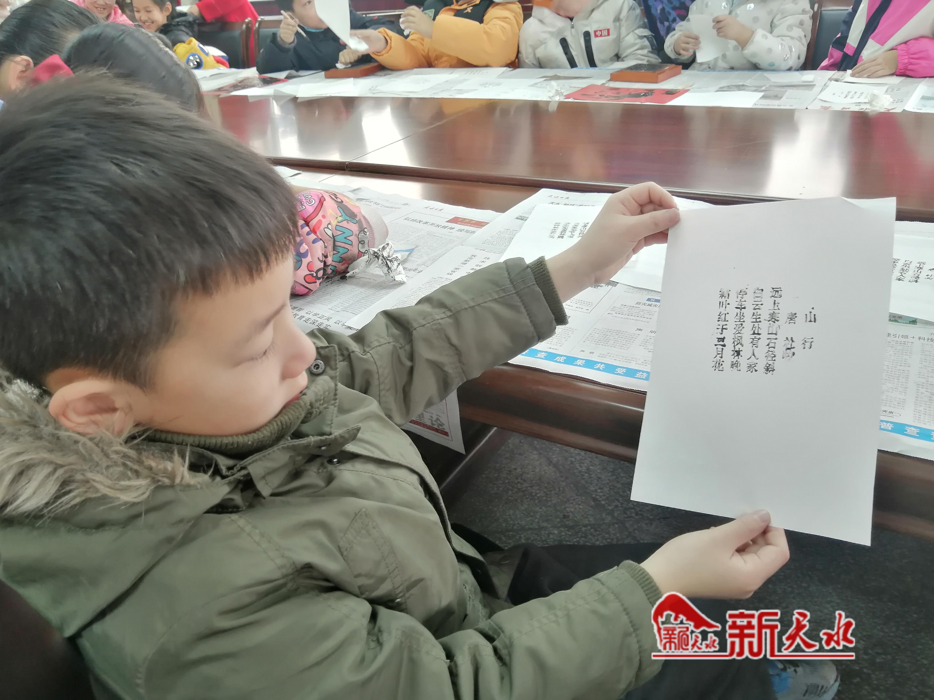 對(duì)于大多數(shù)孩子來(lái)說(shuō),這是他們第一次接觸到活字印刷,所以,在刷墨的輕重、覆紙的準(zhǔn)確性等方面還不是很熟練,致使印刷出的詩(shī)句里的方塊字濃淡有別,有的甚至模糊不清,但這并沒(méi)有影響到孩子們動(dòng)腦動(dòng)手的積極性。在老師的指導(dǎo)下,經(jīng)過(guò)一番正確操作,重新印刷出了令自己滿(mǎn)意的作品。有些孩子手捧著自己的杰作,興致勃勃地大聲朗誦起來(lái),大家身臨其境體驗(yàn)了一回活字印刷的獨(dú)特魅力和濃郁而古樸的文化。