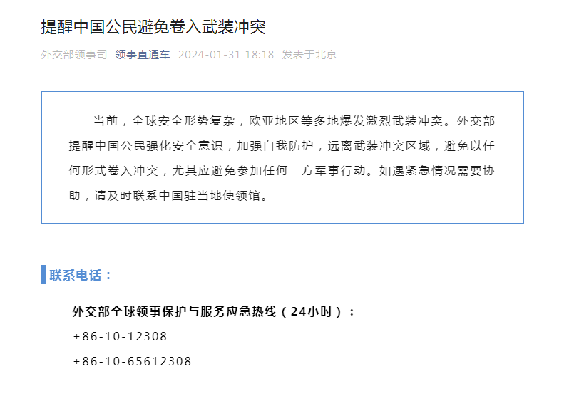 據(jù)外交部“領(lǐng)事直通車”微信公眾號(hào)1月31日消息,當(dāng)前,全球安全形勢復(fù)雜,歐亞地區(qū)等多地爆發(fā)激烈武裝沖突,外交部提醒中國公民強(qiáng)化安全意識(shí),加強(qiáng)自我防護(hù),遠(yuǎn)離武裝沖突區(qū)域,避免以任何形式卷入沖突,尤其應(yīng)避免參加任何一方軍事行動(dòng)。如遇緊急情況需要協(xié)助,請(qǐng)及時(shí)聯(lián)系中國駐當(dāng)?shù)厥诡I(lǐng)館。