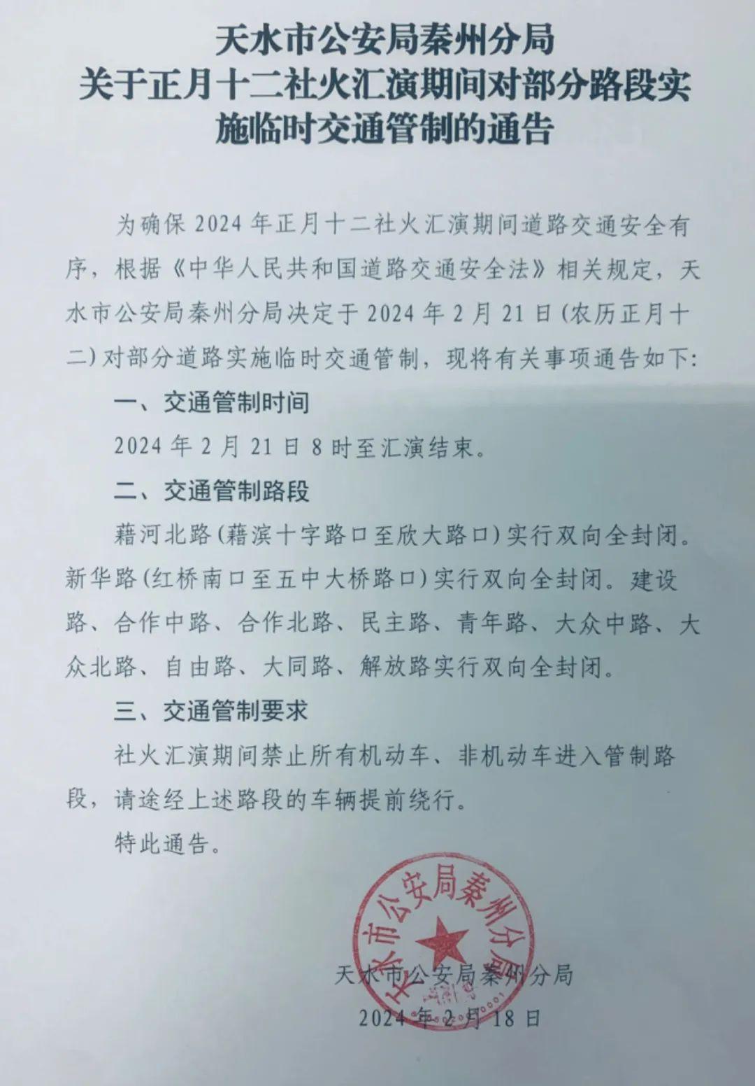 為確保2024年正月十二社火匯演期間道路交通安全有序,根據(jù)《中華人民共和國(guó)道路交通安全法》相關(guān)規(guī)定,天水市公安局秦州分局決定于2024年2月21日(農(nóng)歷正月十二)對(duì)部分道路實(shí)施臨時(shí)交通管制,現(xiàn)將有關(guān)事項(xiàng)通告如下: