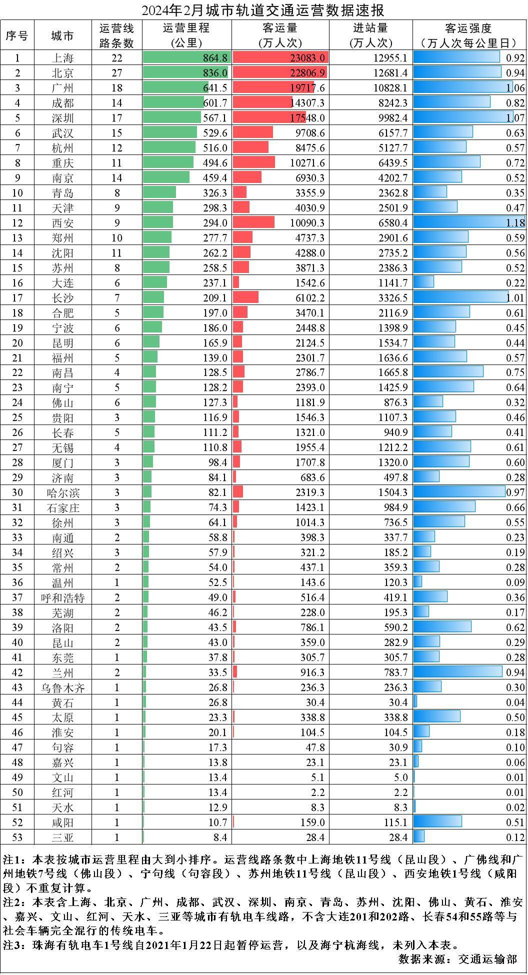 3月12日,據(jù)交通運(yùn)輸部消息,2024年2月,31個?。ㄗ灾螀^(qū)、直轄市)和新疆生產(chǎn)建設(shè)兵團(tuán)共有55個城市開通運(yùn)營城市軌道交通線路308條,運(yùn)營里程10205.6公里,實(shí)際開行列車317萬列次,完成客運(yùn)量20.5億人次,進(jìn)站量12.4億人次。2月份,客運(yùn)量環(huán)比減少6.1億人次,降低22.9%,同比減少1.3億人次,降低6%。2月份全國總運(yùn)營里程的平均客運(yùn)強(qiáng)度為0.693萬人次每公里日,環(huán)比降低17.6%,同比降低14.4%。本月無新開通線路。