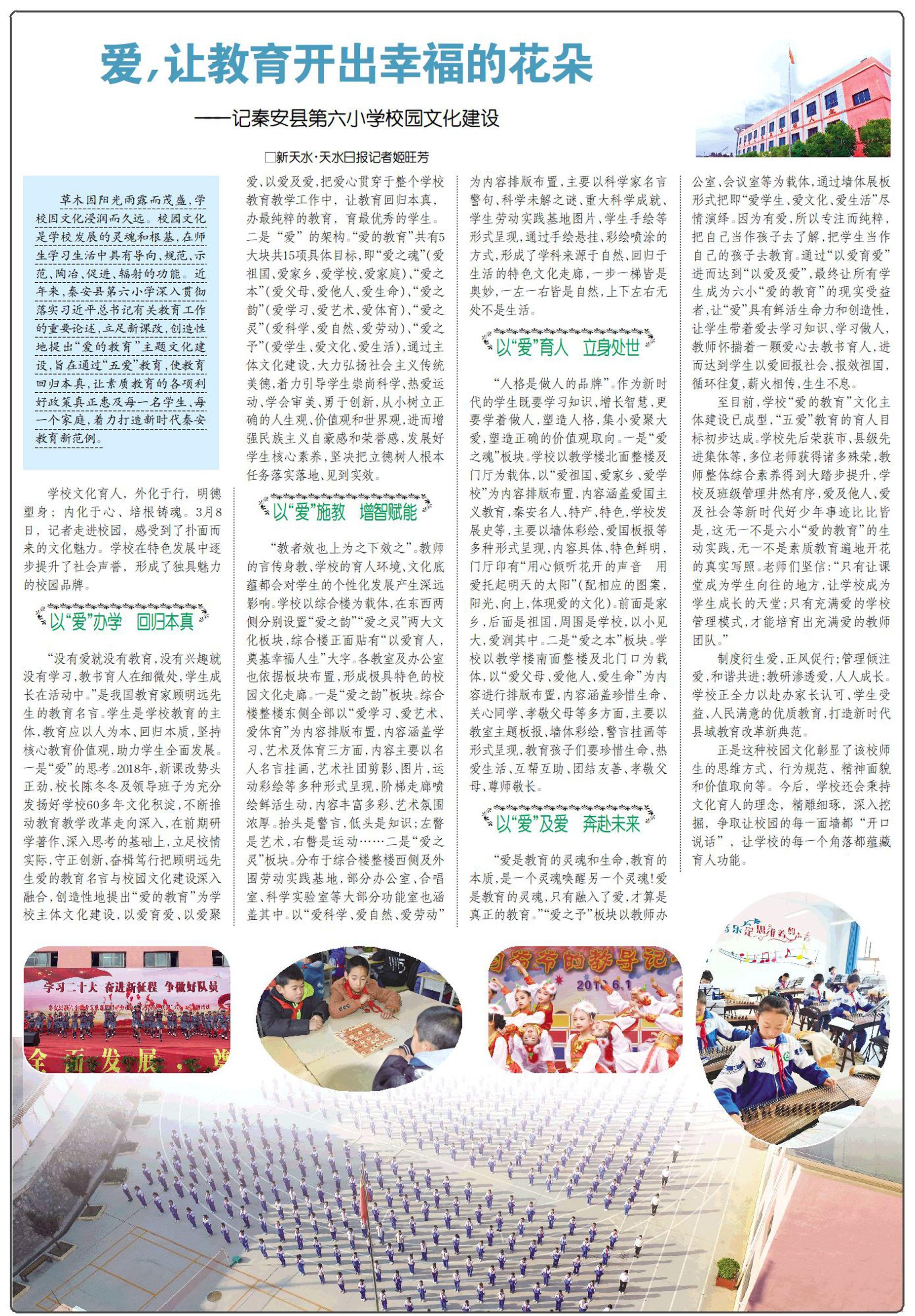 草木因陽光雨露而茂盛,學(xué)校因文化浸潤而久遠。校園文化是學(xué)校發(fā)展的靈魂和根基,在師生學(xué)習生活中具有導(dǎo)向、規(guī)范、示范、陶冶、促進、輻射的功能。近年來,秦安縣第六小學(xué)深入貫徹落實習近平總書記有關(guān)教育工作的重要論述,立足新課改,創(chuàng)造性地提出“愛的教育”主題文化建設(shè),旨在通過“五愛”教育,使教育回歸本真,讓素質(zhì)教育的各項利好政策真正惠及每一名學(xué)生、每一個家庭,著力打造新時代秦安教育新范例。