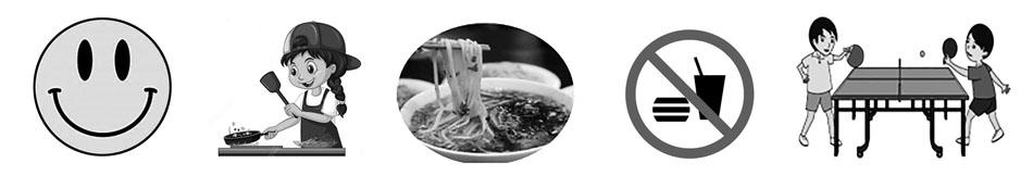 1、聽(tīng)前瀏覽圖片,預(yù)測(cè)考查點(diǎn)。如大家在做此題時(shí),聽(tīng)前先瀏覽圖片,這時(shí)大腦中馬上會(huì)將圖與相關(guān)詞匯匹配,如:看到圖A是張笑臉,對(duì)應(yīng)著單詞smile;看到圖B是一個(gè)學(xué)生在做飯,想到短語(yǔ)cook food;圖C是一碗面條,對(duì)應(yīng)著a bowl of noodles;圖D是一個(gè)禁止帶飲料及食物的標(biāo)識(shí),想到祈使句Don’t take food or drinks.看到圖E對(duì)應(yīng)著play ping-pong/table-tennis。有了這些預(yù)測(cè),就會(huì)減少心中的恐慌。