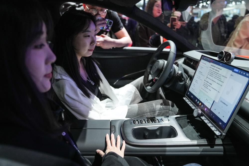 4月28日,在北京車展上,觀眾在小米su7新能源汽車內(nèi)體驗(yàn)人工智能應(yīng)用。 新華社記者 彭子洋 攝