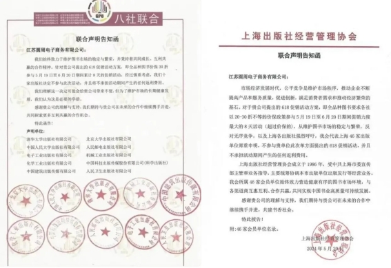 其中,北京10家出版社、上海出版社經營管理協(xié)會代表上海46家出版單位,均聲明不參與江蘇圓周電子商務公司618促銷方案,并且將不承擔活動期間產生的任何返利費用。