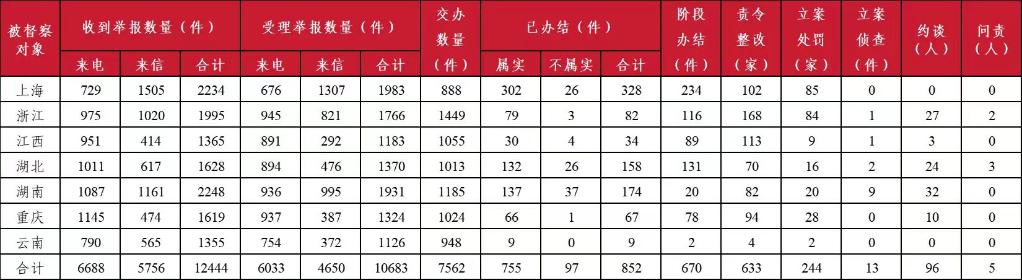 7個督察組于5月7日至9日陸續(xù)進駐上海、浙江、江西、湖北、湖南、重慶、云南七?。ㄊ校?,統(tǒng)籌開展流域督察和省域督察。截至5月20日晚,7個督察組共收到群眾來電、來信舉報12444件,受理有效舉報10683件,經(jīng)梳理合并重復舉報,累計向被督察地方轉(zhuǎn)辦7562件;被督察地方已辦結(jié)或階段辦結(jié)1522件,其中立案處罰244家,立案偵查13件;約談黨政領導干部96人,問責黨政領導干部5人。