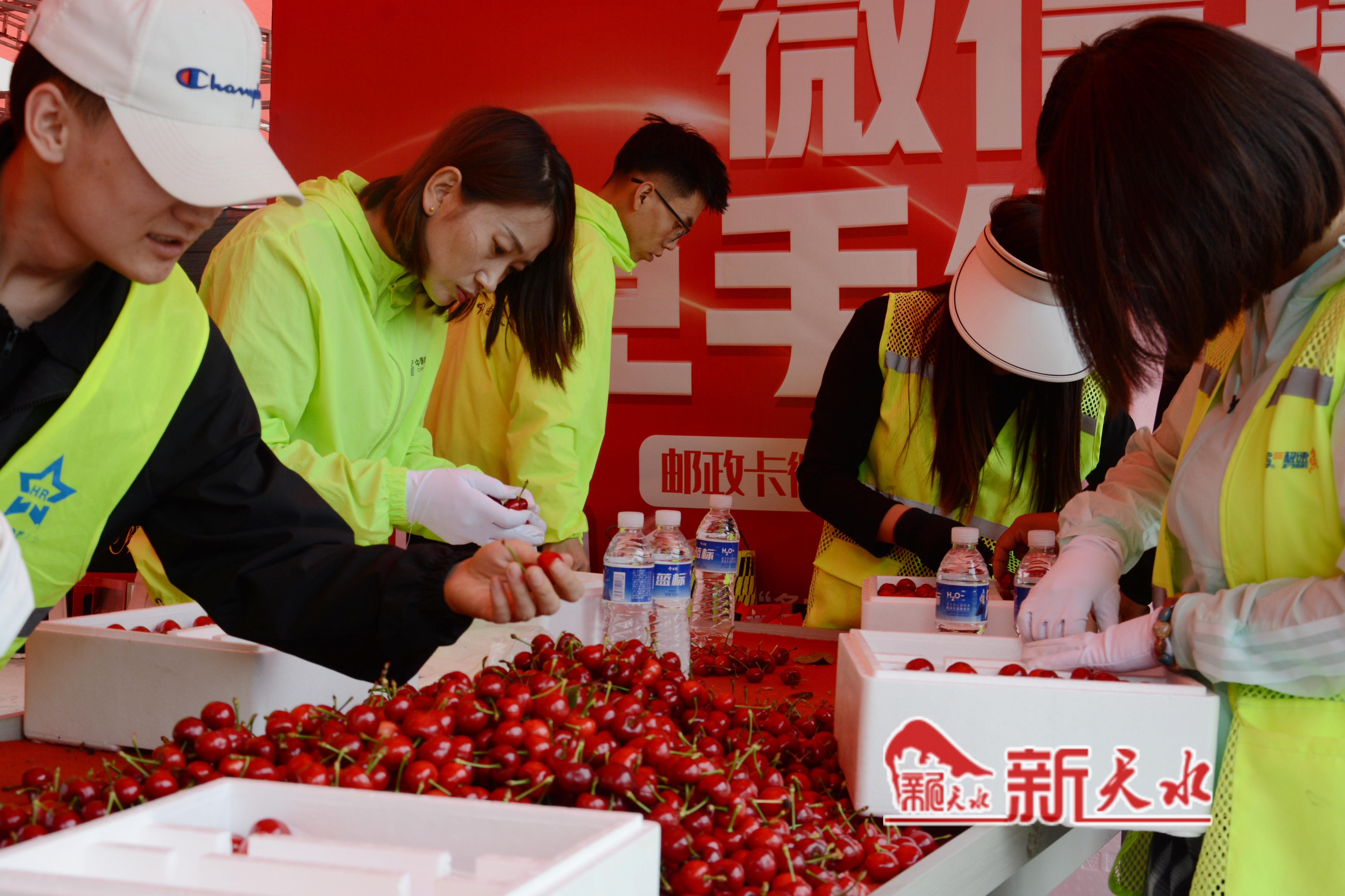 隨后,記者來到位于秦州區(qū)煙鋪村的大櫻桃交易市場,看到天水郵政秦州分公司廣場攬投部經理王林軍與同事們正在對大櫻桃進行分揀、裝箱、稱重、發(fā)貨……同樣忙得不亦樂乎。