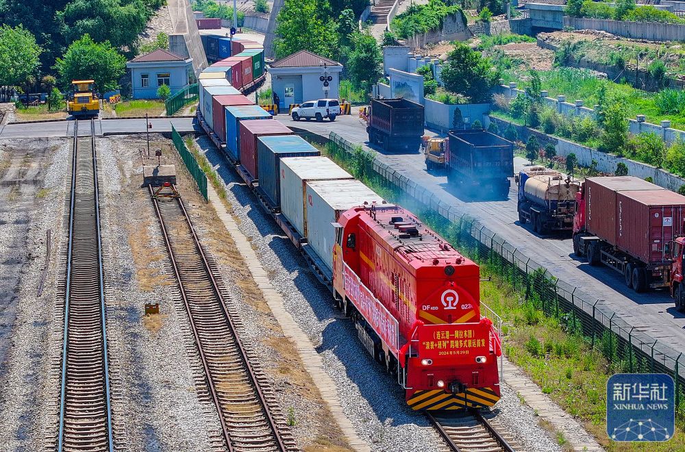 5月29日,首列連云港-阿拉木圖“滾裝+班列”跨境多式聯(lián)運(yùn)專列從在中哈連云港物流合作基地駛出(無人機(jī)照片)。新華社發(fā)(王健民 攝)