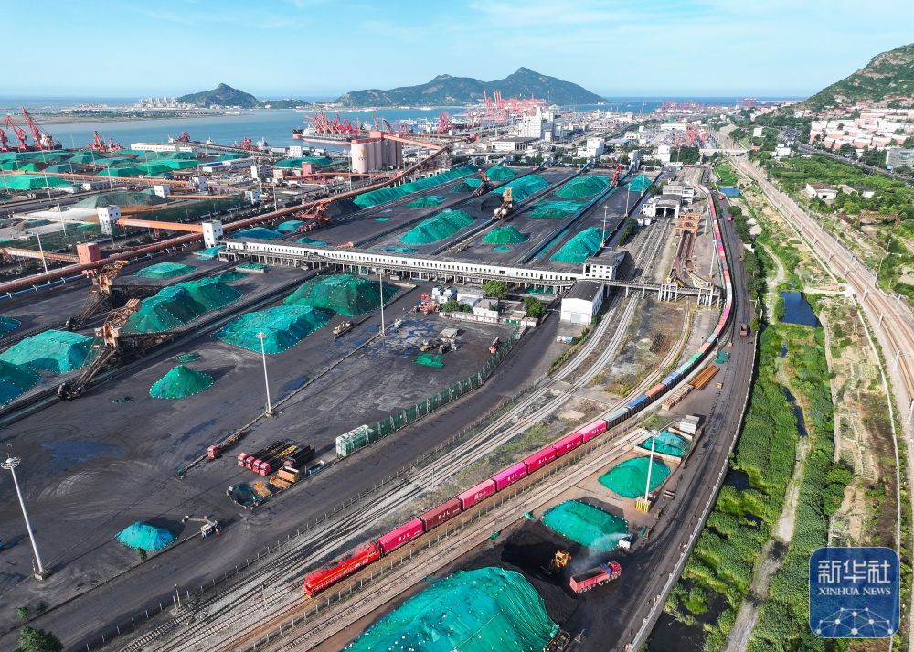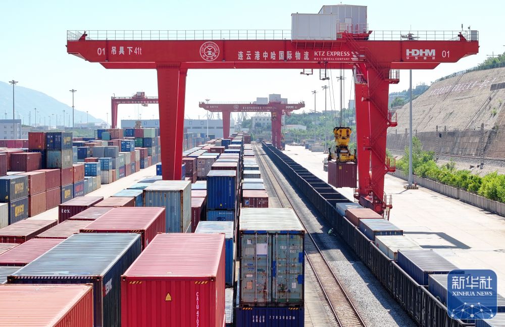 6月26日,“韓國-連云港-中亞”國際多式聯(lián)運(yùn)班列從中哈連云港物流合作基地出發(fā),駛往哈薩克斯坦、烏茲別克斯坦(無人機(jī)照片)。班列運(yùn)載的55個大柜此前于6月13日從韓國境內(nèi)發(fā)出,經(jīng)釜山港海運(yùn)抵達(dá)連云港后轉(zhuǎn)由鐵路運(yùn)輸。新華社記者 季春鵬 攝