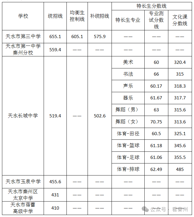根據(jù)《秦州區(qū)2024年高中階段學(xué)校招生工作方案》精神,全區(qū)高中階段學(xué)校招生錄取全部通過“天水中考招生系統(tǒng)”進(jìn)行,現(xiàn)將天水市秦州區(qū)2024年普通高中招生錄取分?jǐn)?shù)線公布如下: