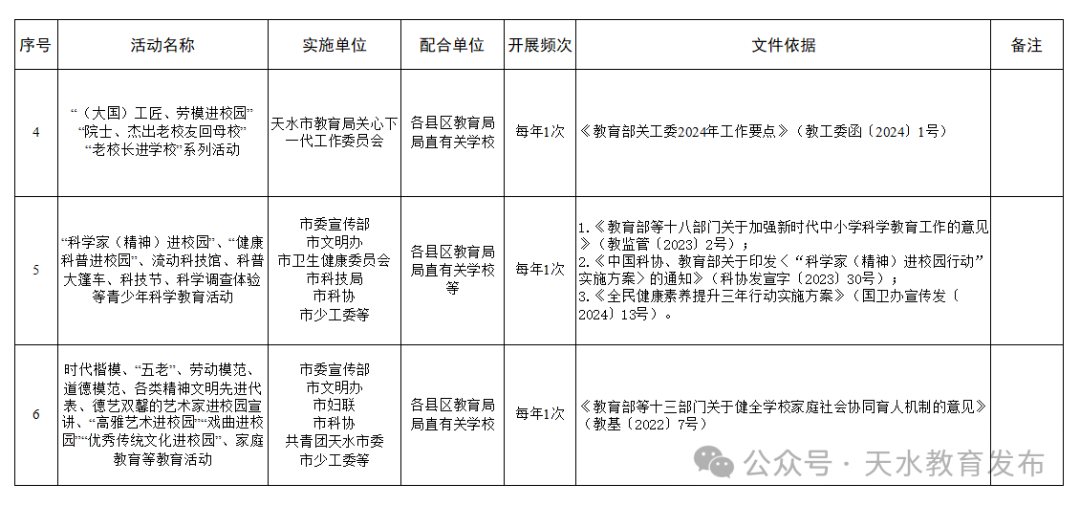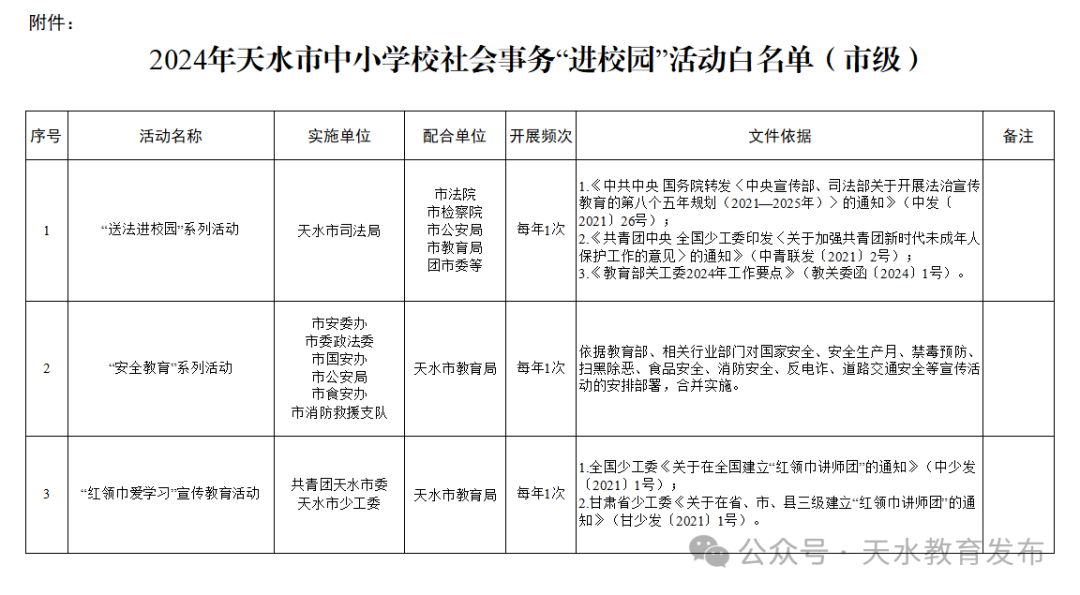 為全面貫徹落實(shí)中共中央辦公廳、國(guó)務(wù)院辦公廳印發(fā)《關(guān)于減輕中小學(xué)教師負(fù)擔(dān)進(jìn)一步營(yíng)造教育教學(xué)良好環(huán)境的若干意見(jiàn)》和中共甘肅省委辦公廳、甘肅省人民政府辦公廳印發(fā)《甘肅省中小學(xué)教師減負(fù)清單》的通知精神,根據(jù)《甘肅省中小學(xué)校社會(huì)事務(wù)“進(jìn)校園”活動(dòng)白名單(省級(jí))》要求,市教育局研究制定了《2024年天水市中小學(xué)校社會(huì)事務(wù)“進(jìn)校園”活動(dòng)白名單(市級(jí))》,現(xiàn)予以公布。