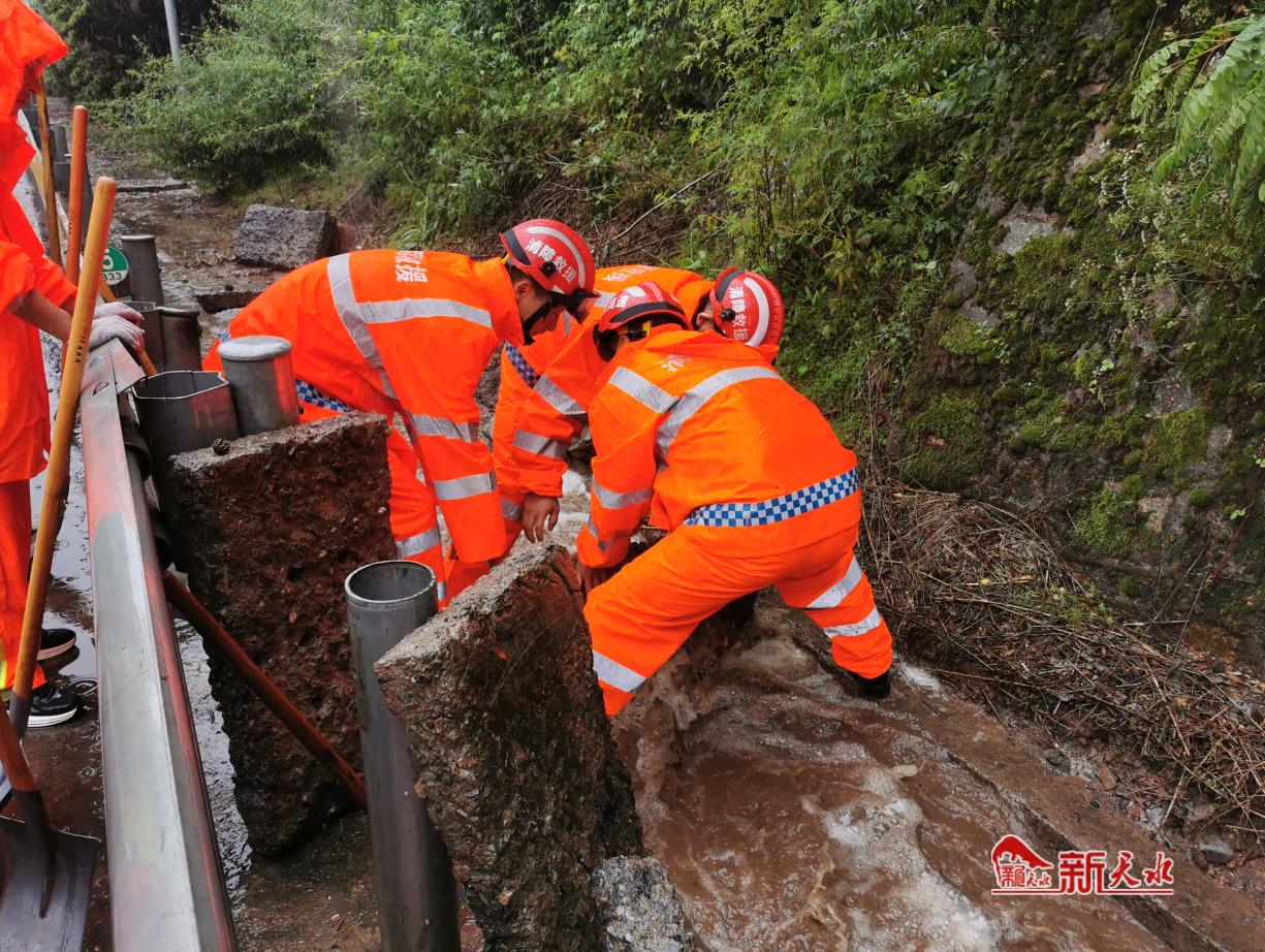 11時36分,隊、所應(yīng)急人員到達現(xiàn)場,制定清理方案,迅速開展搶通作業(yè)。在傾盆大雨中,救援人員與隧道所人員在受阻路段擺放安全警示標(biāo)識和反光錐筒,協(xié)助養(yǎng)護部門進行淤泥清理工作,使用高壓水槍對路面淤泥進行清洗,同時加強現(xiàn)場交通指揮和疏導(dǎo),提醒車輛減速慢行、安全通過。