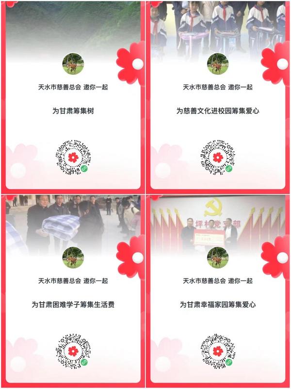 四、參與方式及項(xiàng)目設(shè)置。參與方式以網(wǎng)絡(luò)捐贈(zèng)為主。本次活動(dòng)以“愛(ài)心甘肅結(jié)對(duì)幫扶”和“慈善助力鄉(xiāng)村振興”為主題,天水市及各縣區(qū)慈善總會(huì)采用甘肅省慈善聯(lián)合總會(huì)上線的《愛(ài)心甘肅幸福家園》《愛(ài)心甘肅慈善助學(xué)》《我在甘肅種棵樹(shù)》《慈善文化進(jìn)校園》四類(lèi)項(xiàng)目發(fā)起一起捐。指尖慈善,無(wú)論捐贈(zèng)多少,都是對(duì)我們慈善公益事業(yè)的莫大支持和鼓勵(lì)。歡迎您從2024年8月5日起,按以上一起捐四類(lèi)慈善項(xiàng)目進(jìn)行線上捐贈(zèng)。用手機(jī)掃描其二維碼點(diǎn)擊“捐一筆”,即可在騰訊公益平臺(tái)上進(jìn)行自愿捐款,倡導(dǎo)人人參與、量力而行。還可以組織單位捐款,在募捐項(xiàng)目中選擇“一起捐”分享捐贈(zèng)鏈接邀請(qǐng)您的親人、朋友及同事進(jìn)行捐贈(zèng)。同時(shí),也歡迎單位和個(gè)人通過(guò)線下捐贈(zèng)的形式,通過(guò)銀行轉(zhuǎn)賬直接向本縣區(qū)和天水市慈善總會(huì)的捐款賬戶進(jìn)行捐贈(zèng),捐贈(zèng)善款計(jì)入天水市、縣區(qū)和全省活動(dòng)募捐總額,但不計(jì)入本次活動(dòng)的激勵(lì)額度。