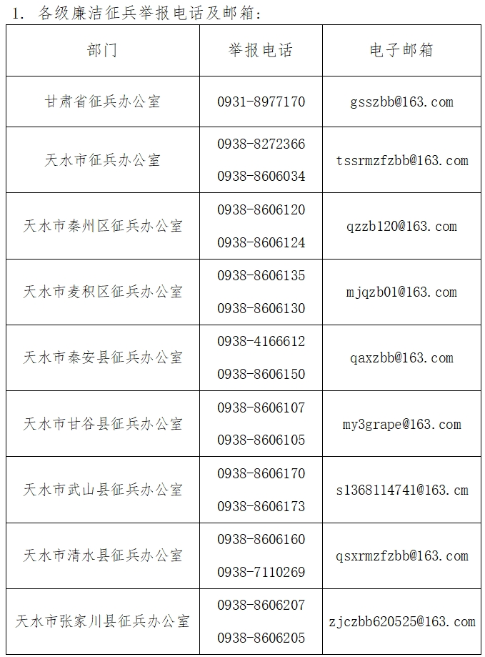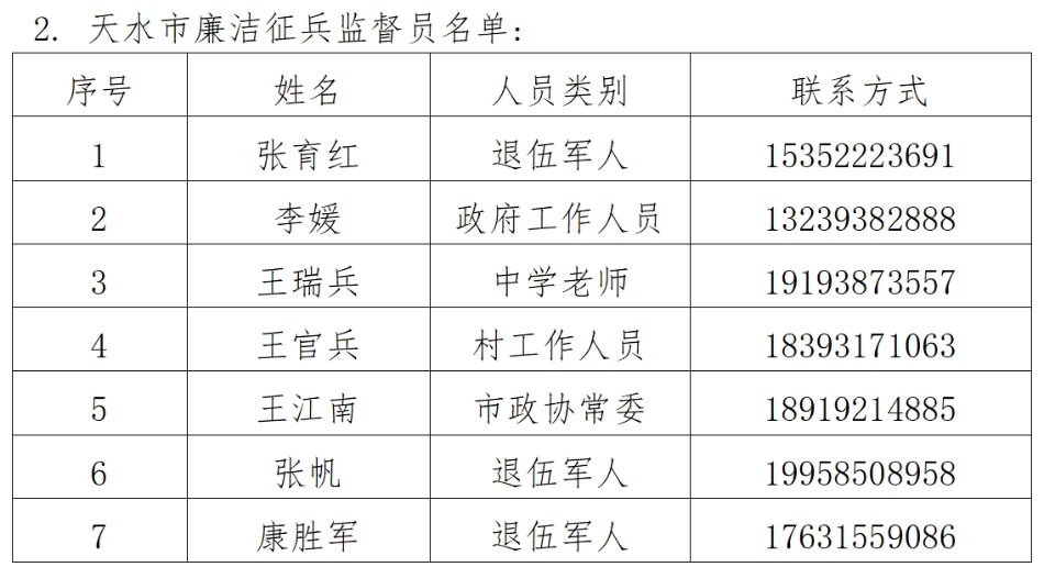 為增強(qiáng)征兵工作透明度,自覺接受人民群眾監(jiān)督,保證全市征兵工作公開、公平、公正?,F(xiàn)將2024年天水市廉潔征兵監(jiān)督員及監(jiān)督舉報(bào)電話予以公布,歡迎社會(huì)各界對征兵工作進(jìn)行監(jiān)督。