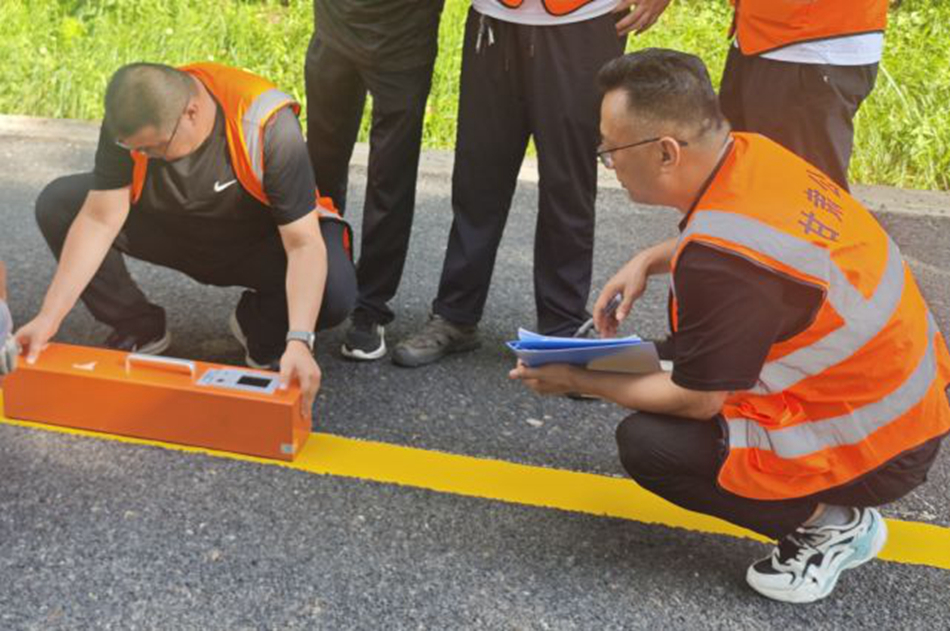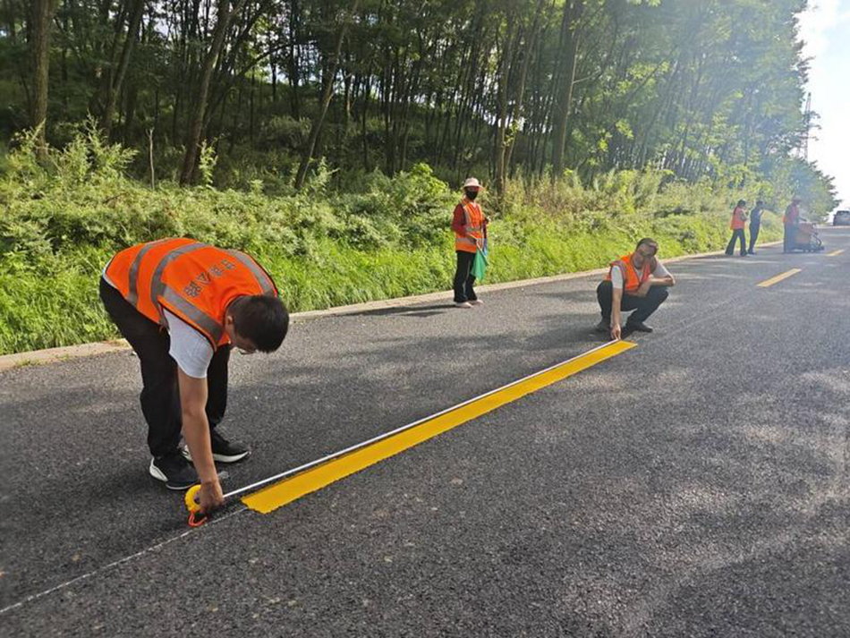 施劃前,該段制定了詳細(xì)的施工方案,對(duì)施工班組進(jìn)行了崗前安全培訓(xùn)和技術(shù)交底。施工過程中嚴(yán)格按照“測(cè)量放線、路面清理、標(biāo)線施劃、成品保護(hù)”的作業(yè)流程操作。同時(shí),按照“邊施工邊檢測(cè)”的原則,施工期間邀請(qǐng)?zhí)焖行脑囼?yàn)檢測(cè)人員對(duì)施劃的新標(biāo)線進(jìn)行“厚度、寬度、反射系數(shù)、實(shí)線和虛線間距”等各項(xiàng)技術(shù)指標(biāo)檢測(cè),確保標(biāo)線規(guī)范、醒目、完善。(趙俊宏 雷震霆)