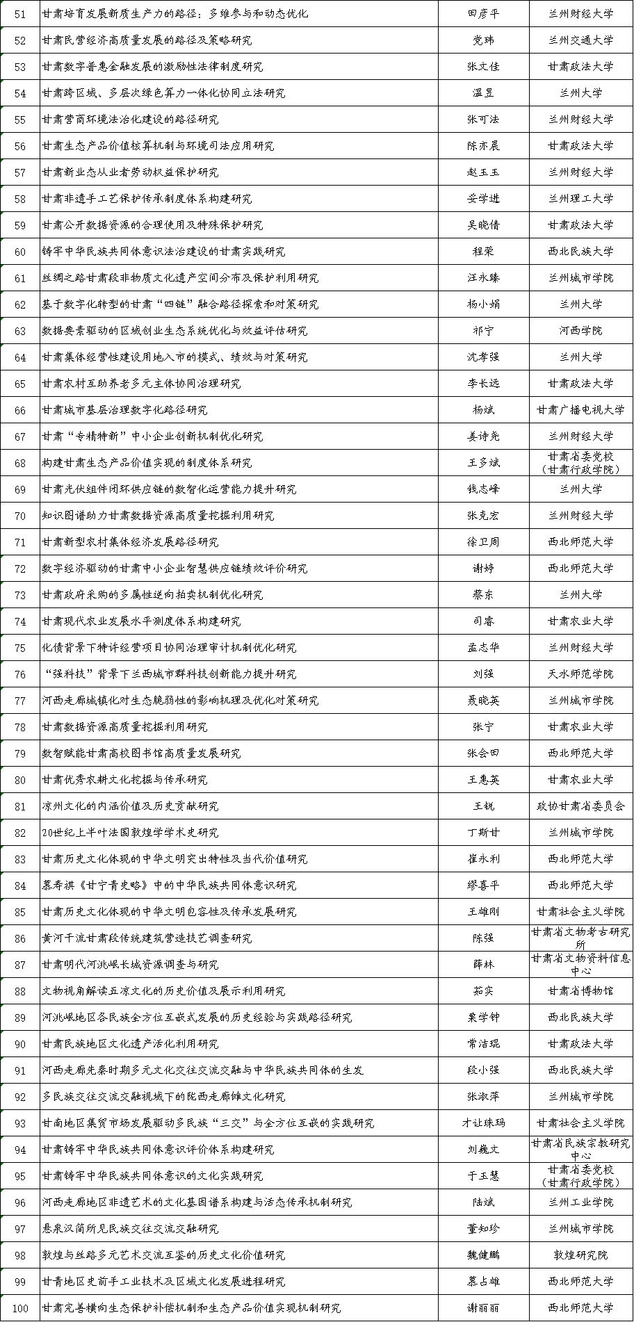 根據(jù)《甘肅省哲學(xué)社會(huì)科學(xué)規(guī)劃項(xiàng)目管理辦法》有關(guān)規(guī)定,經(jīng)中共甘肅省委宣傳部組織評審和會(huì)議研究,現(xiàn)將2024年省哲學(xué)社會(huì)科學(xué)規(guī)劃年度項(xiàng)目擬立項(xiàng)名單予以公示。公示時(shí)間為2024年9月2日至9月6日(5個(gè)工作日)。公示期間如有異議,請以書面形式向省委宣傳部反映,并提供必要的證據(jù)材料,以便核實(shí)查證。提出異議者須提供本人真實(shí)姓名、工作單位、聯(lián)系電話等有效聯(lián)系方式,凡匿名或超出期限的不予受理。