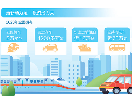 “開展交通運輸大規(guī)模設(shè)備更新,既有利于擴大投資、完善基礎(chǔ)設(shè)施、推動產(chǎn)業(yè)升級,也能促進節(jié)能降碳、助力交通物流降本增效?!苯煌ㄟ\輸部有關(guān)負責(zé)人介紹,2023年,全國擁有鐵路機車2萬多臺、營運汽車1200多萬輛、水上運輸船舶近12萬艘、公共汽電車近70萬輛,其中部分設(shè)備需要更新,投資潛力較大。