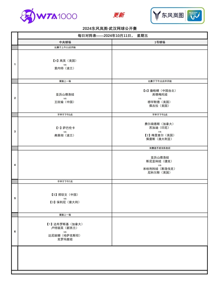 ??中央球場日場比賽,4號種子高芙將在第一場出戰(zhàn),隨后中國金花王欣瑜登場迎戰(zhàn)亞歷山德洛娃,而薩巴倫卡將在第三場迎戰(zhàn)弗萊徹。