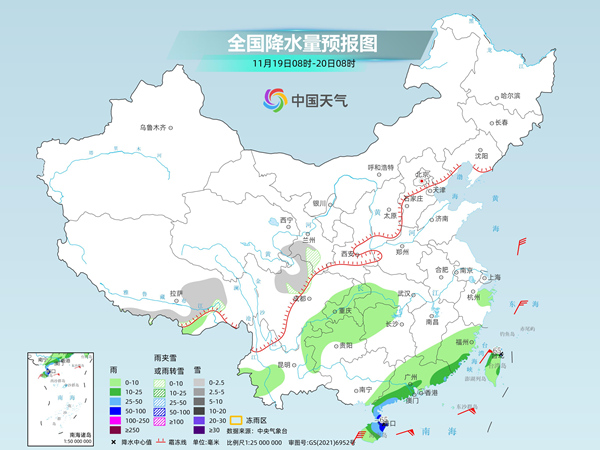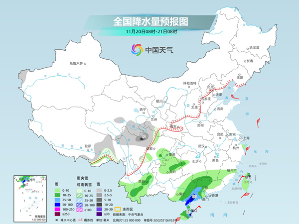 具體來看,中央氣象臺預計,今天,西藏東部和南部、甘肅中南部、川西高原北部等地部分地區(qū)有小雪或雨夾雪。福建東南部、華南南部、海南島、臺灣島等地部分地區(qū)有中到大雨,其中,廣東西南部沿海、海南島東北部等地部分地區(qū)有暴雨。