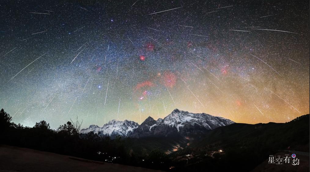 2023年12月14日在云南省麗江市玉龍雪山拍攝的雙子座流星雨(多張疊加)。(霍春雷攝)