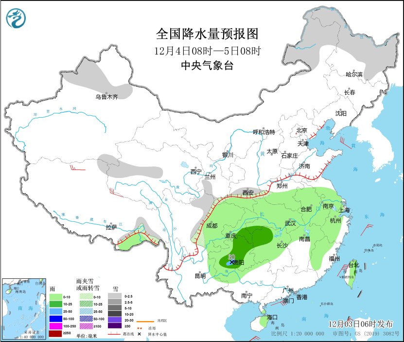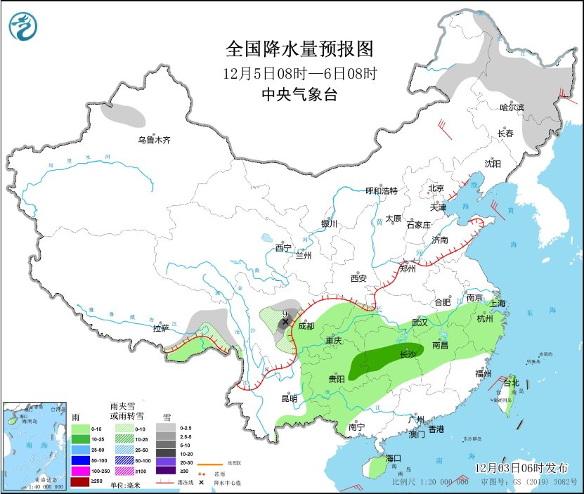 12月4日08時(shí)至5日08時(shí),內(nèi)蒙古東北部、黑龍江大部、新疆北部和沿天山地區(qū)、西藏東南部、青海西部、川西高原北部、陜西南部等地部分地區(qū)有小雪或雨夾雪。西北地區(qū)東南部、黃淮西部、江淮大部、江漢、江南大部、西南地區(qū)東部、廣西西北部、海南島、臺(tái)灣島大部等地部分地區(qū)有小到中雨,其中,貴州南部等地部分地區(qū)有大雨(25~30毫米)。西藏北部部分地區(qū)有4~6級(jí)風(fēng)(見圖2)。