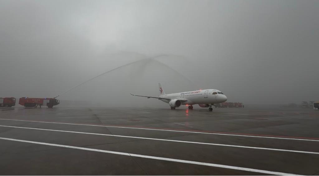 國產(chǎn)大飛機(jī)C919在重慶江北國際機(jī)場通過水門。新華社記者 趙佳樂 攝