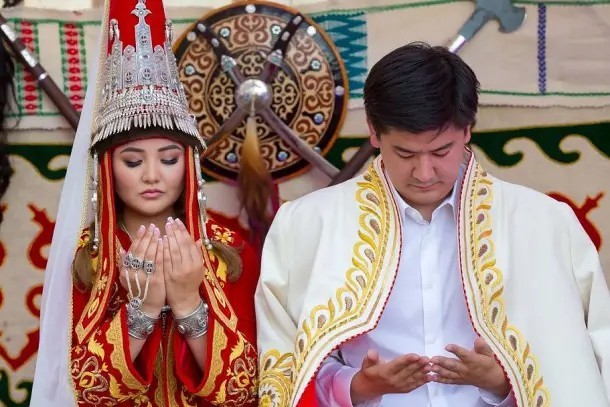 在哈薩克斯坦,貝塔莎(Betashar)是在婚禮上揭開新娘面紗的儀式。新娘戴著哈薩克傳統(tǒng)頭飾和面紗,被護送到賓客云集的大廳。擔任歌手和儀式主持人的阿肯(akyn)在唱完婚禮歌后揭起新娘的面紗。準婆婆迎接新娘進入家庭,新郎會牽起新娘的手。然后親戚們向新婚夫婦贈送糖果和硬幣。