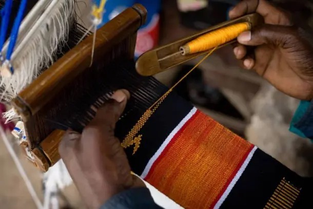 肯特是加納的傳統(tǒng)織物,以絲綢、棉花或人造纖維為原料,由水平織布機編織為條狀布料。織物的顏色和設計受使用者的年齡、社會地位、性別影響,成品常被賦予與諺語或社會情境相關的名字。無論性別,每人都可參與制作??咸夭粌H促進了信息傳遞與交流,還作為身份構建的手段,反映不同社區(qū)的社會歷史。
