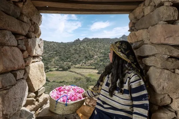 在沙特阿拉伯的塔伊夫地區(qū),玫瑰種植和相關活動是社會和宗教儀式中不可或缺的一部分,也是本地人重要的收入來源。采摘季從三月開始,農民會全家出動,在清晨采摘玫瑰,然后運到當?shù)厥袌龀鍪刍驇Щ丶抑姓麴s加工。當?shù)厣鐓^(qū)會將玫瑰水和玫瑰精油用于美容產品、傳統(tǒng)醫(yī)學以及食品和飲品中。塔伊夫玫瑰和玫瑰水也常被用作饋贈禮品。