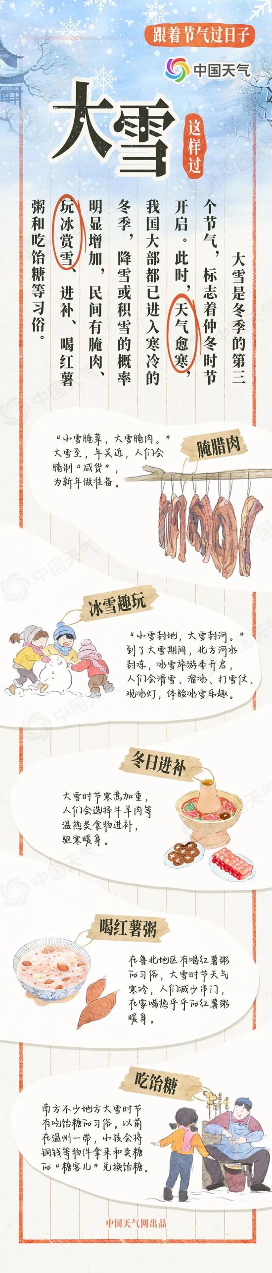春生夏長,秋收冬藏,跟著節(jié)氣過日子。今天(12月6日)進(jìn)入冬天的第三個(gè)節(jié)氣——大雪,常年大雪時(shí)節(jié)冬季的腳步繼續(xù)南下,并將成功翻越南嶺,我國超九成國土?xí)M(jìn)入寒冷的冬天。寒冷愈發(fā)明顯,北方降雪和積雪的概率也隨之增加,黃河以北地區(qū)河面被冰封。此時(shí)年關(guān)將近,民間有腌臘肉、玩冰賞雪、冬日進(jìn)補(bǔ)等習(xí)俗,中國天氣網(wǎng)特別推出大雪風(fēng)俗圖鑒和大雪全國天氣地圖,看看這個(gè)節(jié)氣怎么過。