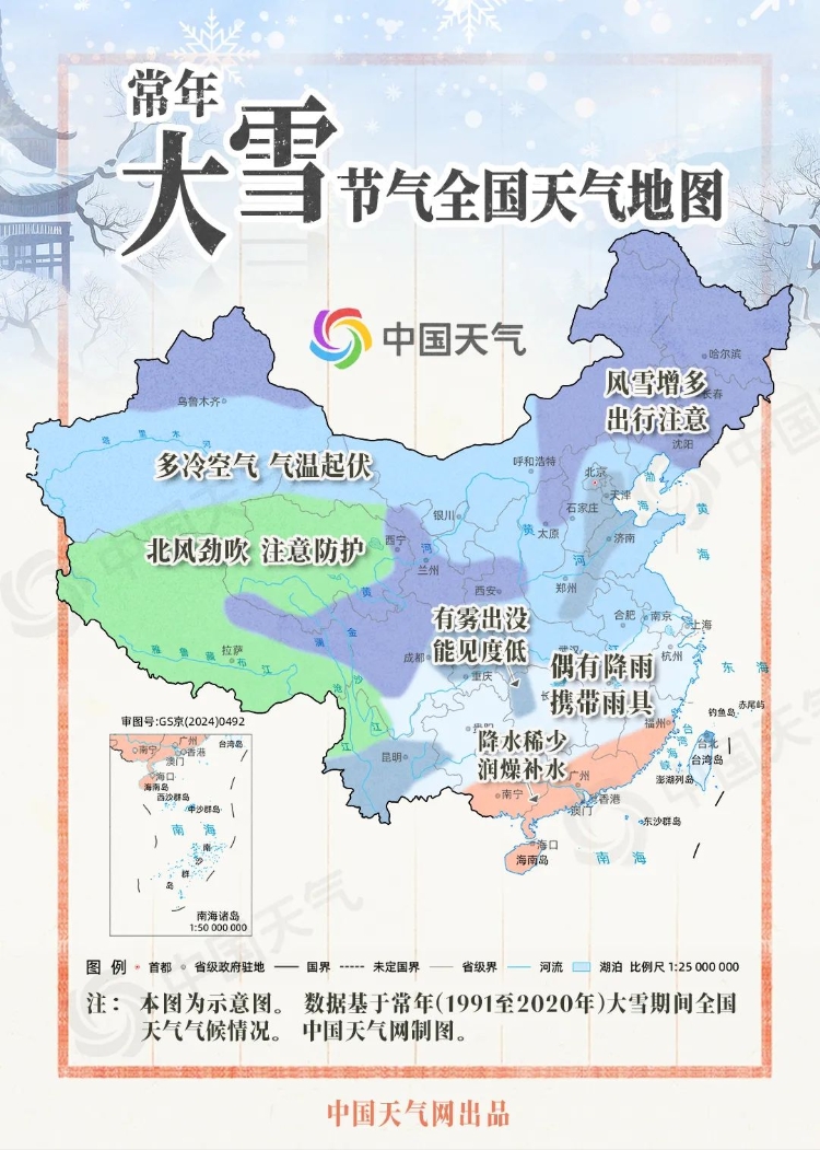 大雪時(shí)節(jié),冷空氣活躍且往往強(qiáng)度較強(qiáng),我國大部氣溫繼續(xù)顯著下降。北方降雪增多,局地需警惕強(qiáng)風(fēng)雪,平原地區(qū)霧和霾天氣易出沒,能見度降低;南方雨水減少,華南大部進(jìn)入全年最干燥的時(shí)段。