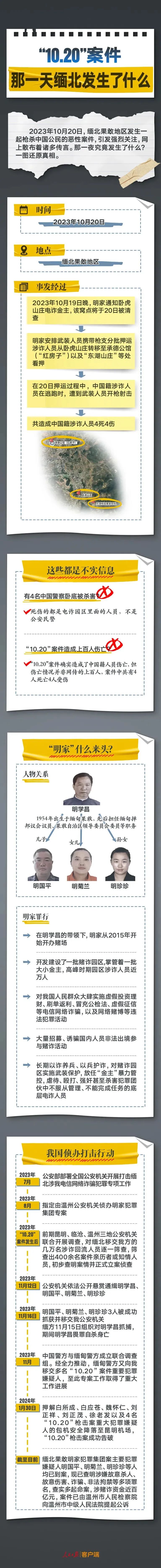 2023年11月12日,溫州公安機關依法公開懸賞通緝明學昌、明國平、明菊蘭、明珍珍。11月15日夜,緬方組織對明學昌抓捕,期間明學昌畏罪自殺身亡。11月16日,在緬甸各方的大力配合下,明國平、明菊蘭、明珍珍3人被成功抓獲并移交我方。為加快案件偵辦進度,公安機關在云南臨滄依法對3人開展審訊工作。