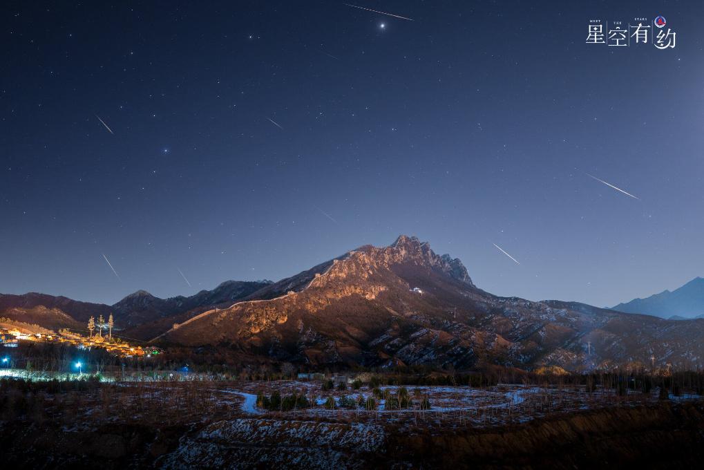2024年1月4日在北京司馬臺(tái)長(zhǎng)城拍攝的象限儀座流星雨(多張疊加)。(霍春雷攝,星聯(lián)CSVA供圖)