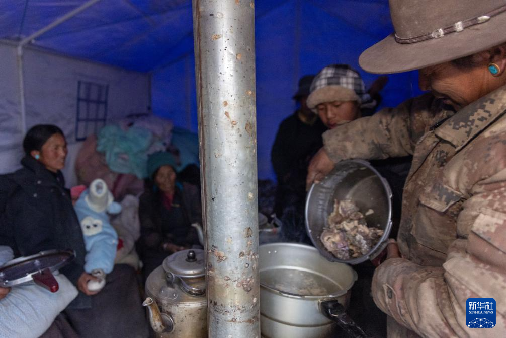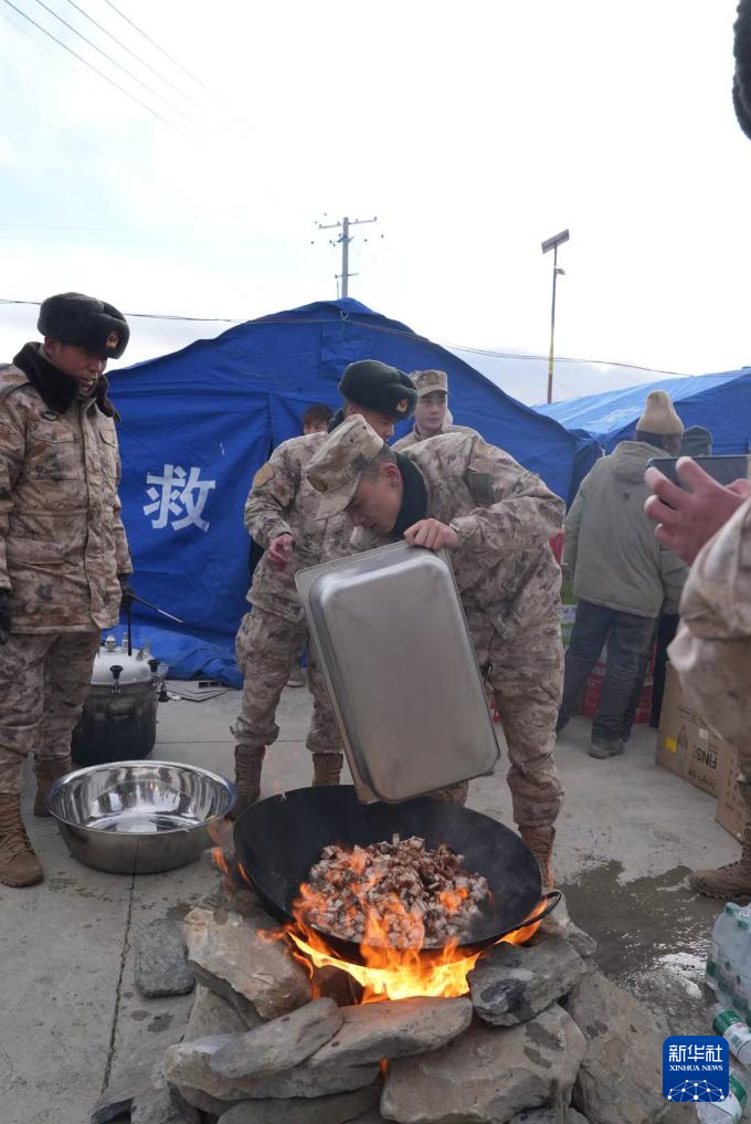 1月7日,在定日縣長所鄉(xiāng)古榮村,救援人員在準備晚飯。