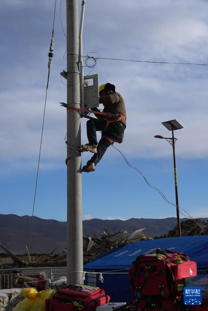 1月7日,在定日縣長所鄉(xiāng)古榮村,工作人員在搶修供電線路。