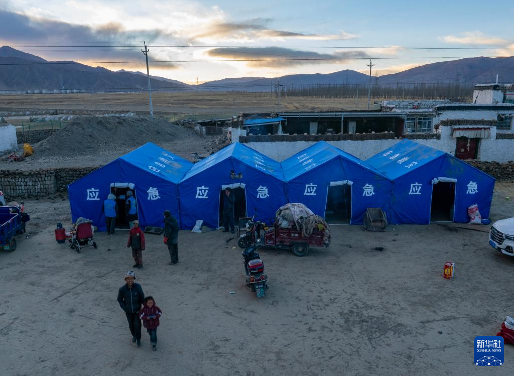 1月7日,在拉孜縣曲下鎮(zhèn)土林村,受災群眾搬入應急帳篷(無人機照片)。
