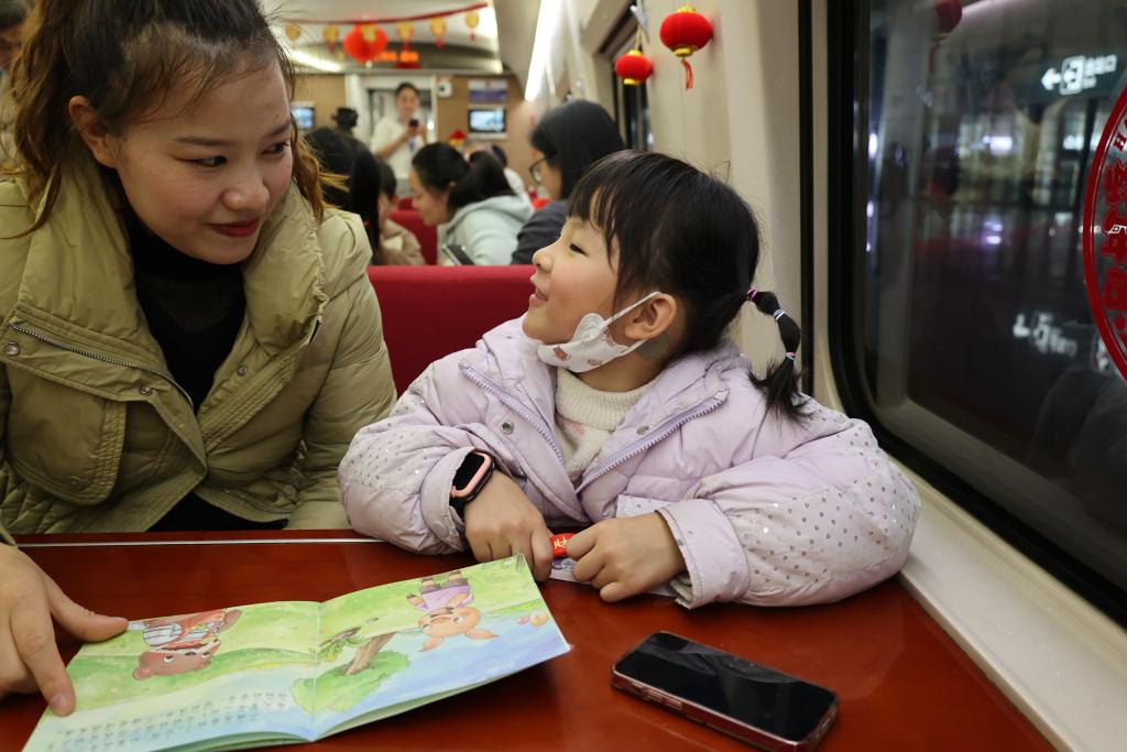 “我拼得最快!”“我會(huì)答,我來(lái),我來(lái)!”……走進(jìn)由餐車車廂改造的“遛娃艙”,各式各樣的卡通圖案格外醒目,充滿童趣溫馨。餐桌和過(guò)道上擺滿了零食和兒童玩具,餅干、牛奶、棒棒糖、積木、拼圖應(yīng)有盡有。車廂一角還有“高鐵課堂”,工作人員手持繪本讀物給孩子們講故事、回答提問(wèn),現(xiàn)場(chǎng)還給孩子們組織活動(dòng)并發(fā)放獎(jiǎng)品。此外,“遛娃艙”還進(jìn)行了智慧升級(jí),科技互動(dòng)體驗(yàn)吸引了不少小朋友的注意力。