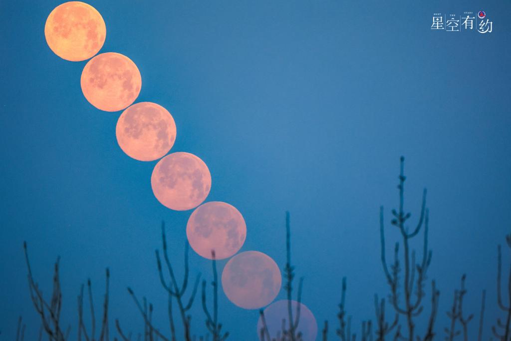 2023年2月6日在北京豐臺(tái)拍攝的元宵節(jié)滿(mǎn)月的月落過(guò)程(多張疊加)。(王俊峰攝,星聯(lián)CSVA供圖)