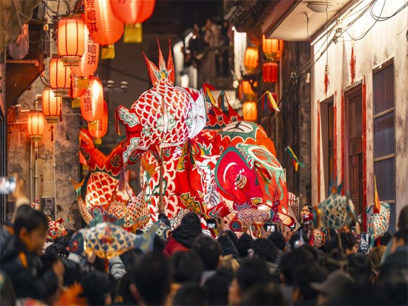 春節(jié)期間,游客在安徽歙縣北岸鎮(zhèn)瞻淇村觀賞魚燈巡游。(歙縣北岸鎮(zhèn)人民政府供圖)